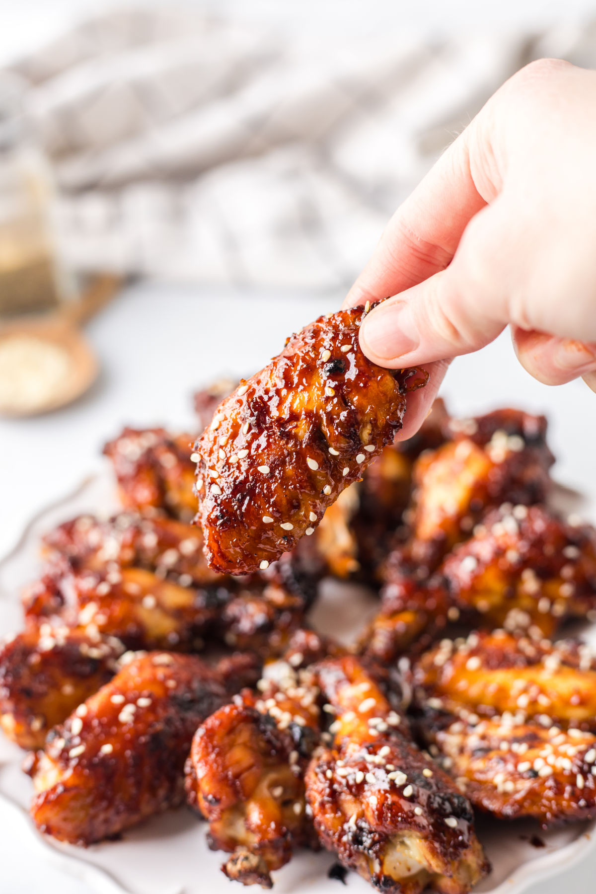 - Transfer the wings to a platter to serve and sprinkle with sesame seeds.1 tablespoon sesame seeds